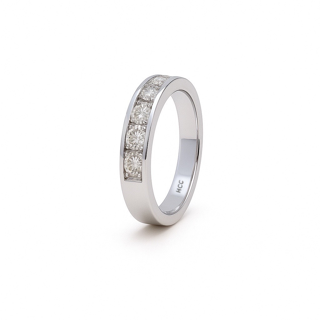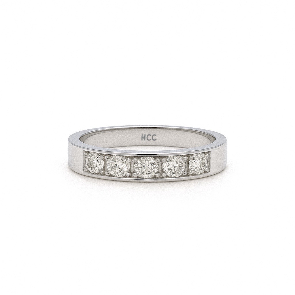 鑽石數量:5顆 鑽石重量:約100分 戒圍:11.5 材質:18k 750 白k金 購買一年內可免費修改戒圍上下兩圍一次